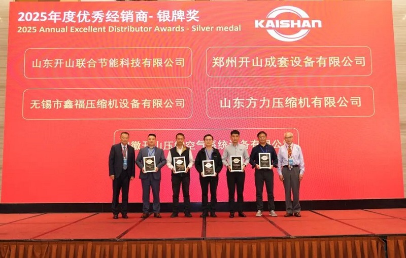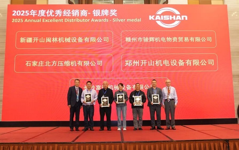 本屆大會按慣例,為34家優(yōu)秀經(jīng)銷單位頒發(fā)了獎牌。與以往不同的是,其中十家經(jīng)銷單位因為連續(xù)五年獲評“最佳經(jīng)銷單位”,獲頒特制銀質(zhì)獎?wù)?。宜昌博力開山機電設(shè)備有限公司和重慶開山一機節(jié)能設(shè)備有限公司因為2025年度銷售/訂單突破億元,首次獲頒金質(zhì)獎?wù)?。其中宜昌博力已連續(xù)三年銷售過億元,主要銷售開山重工的全液壓鉆車機系列高端產(chǎn)品。重慶開山一機則銷售包括干式無油螺桿空壓機、大功率螺桿空壓機、變節(jié)距干式真空泵、離心式壓縮機等高端產(chǎn)品。公司祝賀并感謝這兩家公司在幫助開山拓展高端市場取得的突出成就。曹董號召全體經(jīng)銷單位以他們?yōu)榘駱?,冀望有更多的銷售超億元經(jīng)銷單位涌現(xiàn)。